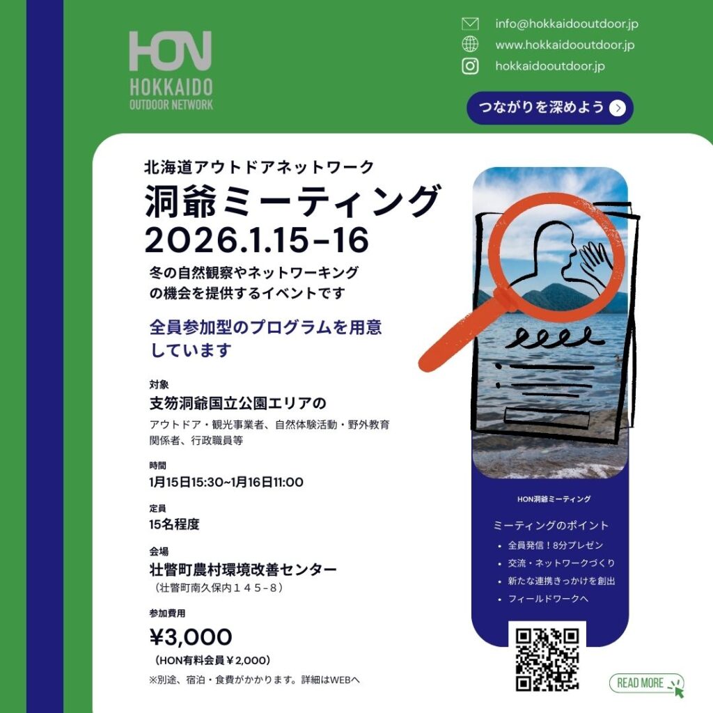 この度、支笏洞爺国立公園エリアを中心に活動する事業者を対象に、より実践的で濃密な情報交換を行うため、HON洞爺ミーティングを開催します。本ミーティングは、参加者全員がプレゼンターとなる「全員参加型」の形式を採用します。日頃の活動で培った知見や課題、新たな試みを相互に発信し合うことで、単なる名刺交換にとどまらない「顔の見える関係性」を構築します。近隣エリアで活動するガイド、自然体験指導者、観光事業者の皆様の積極的なご参加をお待ちしています。