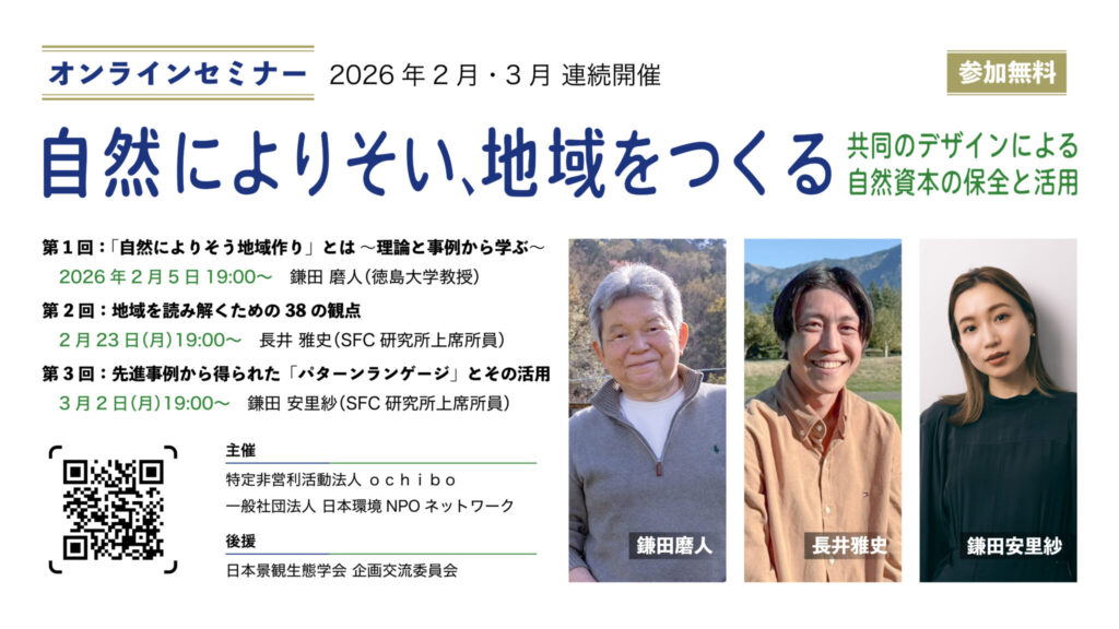 日時:2026年2月5日 (木)19:00〜 内容:書籍に込めた思いや全体構成を通じて、自然と人との関係性の再構築を目指す地域づくりの思想を解説します。また、書籍でも取り上げられた具体的な実践事例をもとに、地域固有の課題と取り組みの工夫についてお話しします。